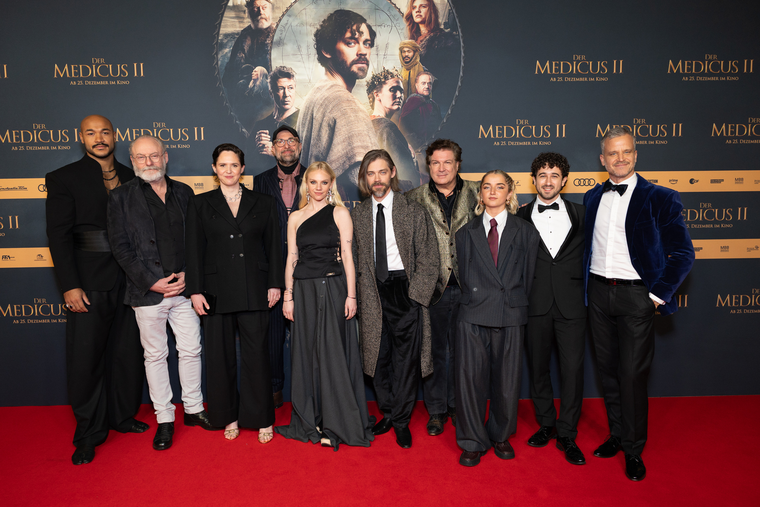 COLOGNE, GERMANY – DECEMBER 15: (L-R) Malick Bauer, Liam Cunningham, Emily Cox, director Philipp Stölzl, Aine Rose Daly, Tom Payne, Francis Fulton-Smith, Rosie Boore, Jaouhar Ben Ayed and Mate Haumann attend the premiere of Constantin Film’s „The Physician II” at Cinedom on December 15, 2025 in Cologne, Germany. (Photo by Andreas Rentz/Getty Images for Constantin Film)