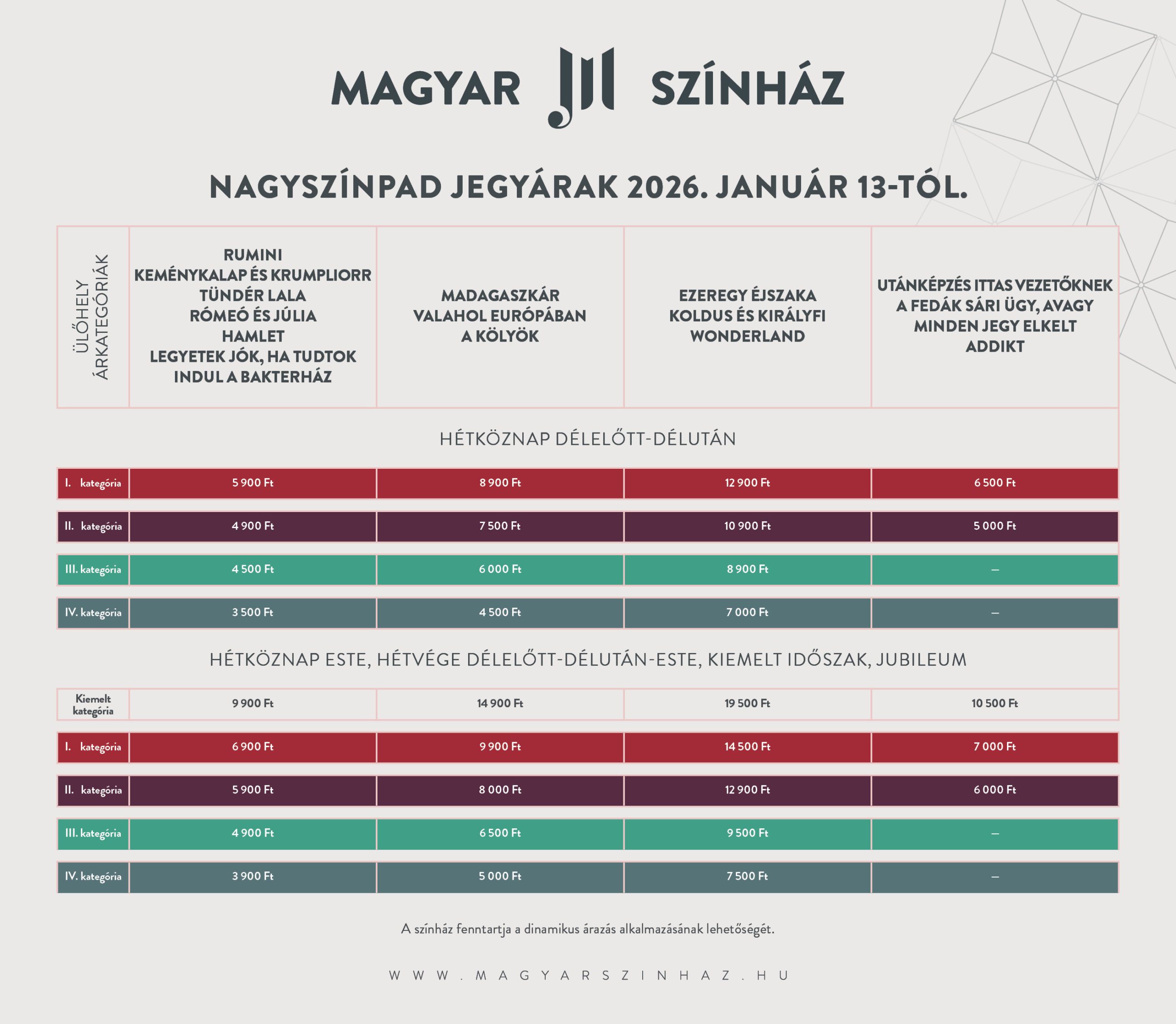 - Egyes előadásainknál automatikus dinamikus jegyárral dolgozunk (A dinamikus vagy kereslet alapú árazás egy olyan kifinomult árazási stratégia, melyben az ár a kereslet és kínálat viszonyának függvényében naponta többször felülvizsgálatra és finomhangolásra kerül.)