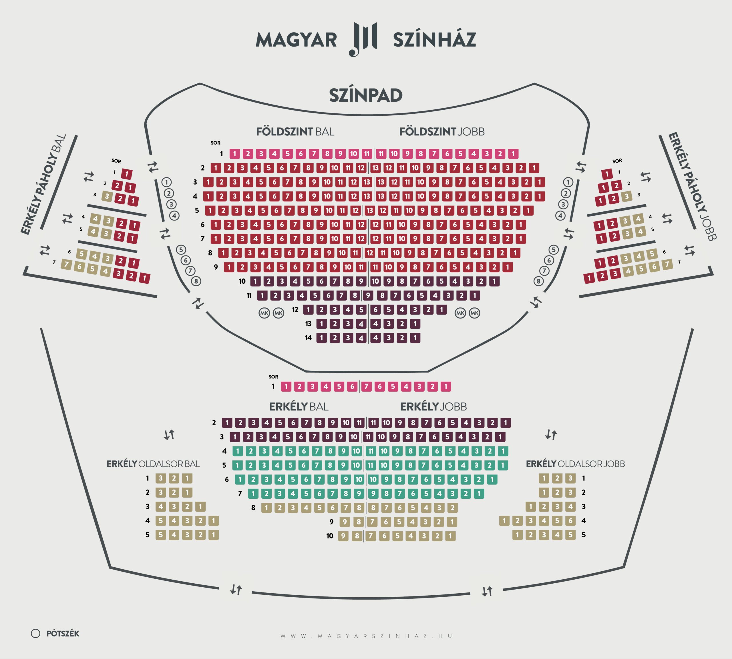 Nagyszínpad földszinti nézőtér jobb és bal oldalán a 12. sor szélére (2-2 hely) tud a kerekesszékével a mozgássérült néző helyet foglalni.